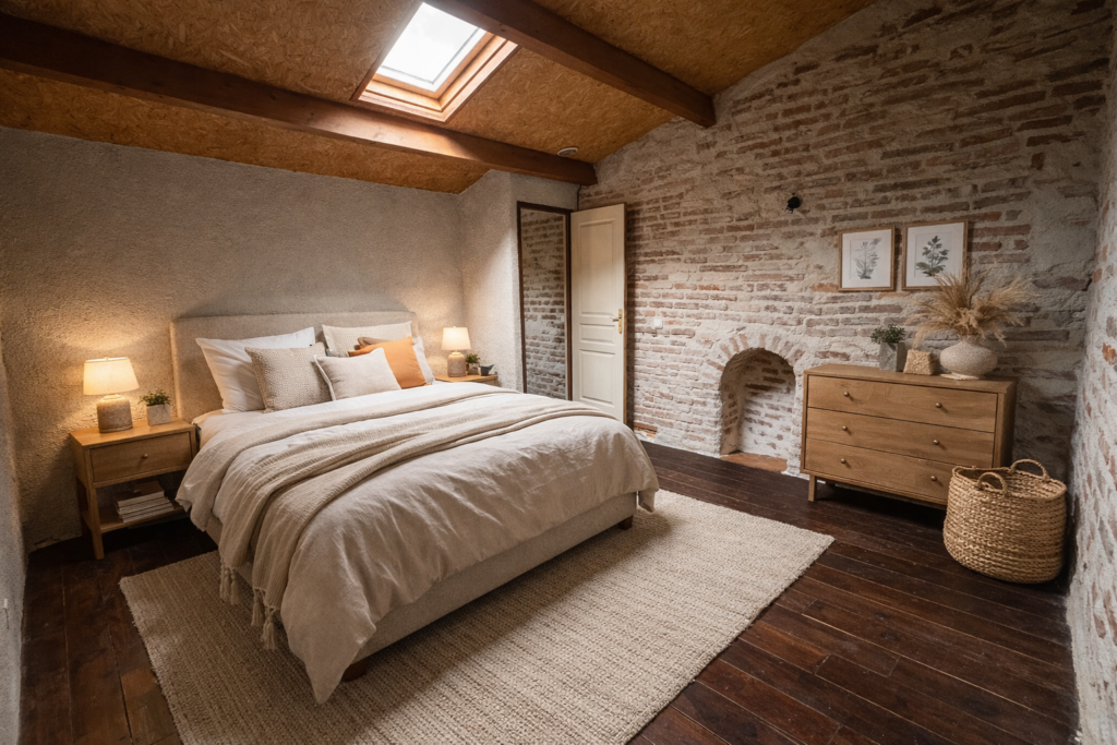Au dernier niveau, une chambre sur mezzanine fermée apporte charme et intimité.