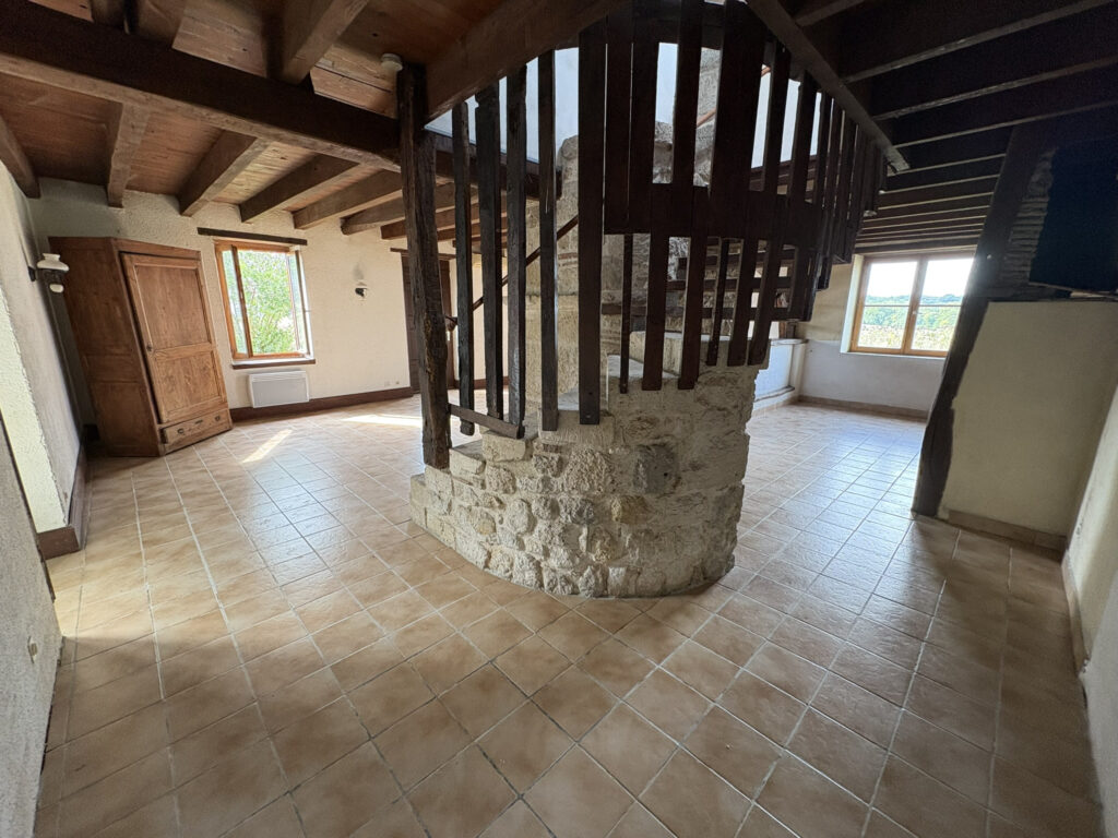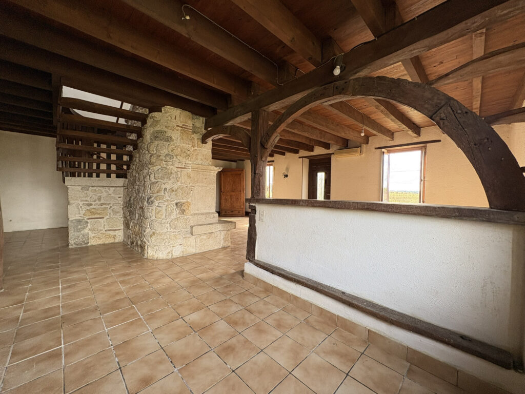 Au rez-de-chaussée, une grande pièce de vie lumineuse réunissant cuisine, salon et séjour, organisée autour d’une somptueuse cheminée du XVIe siècle et d’un splendide escalier en bois et pierre qui donne un caractère unique à l’ensemble.